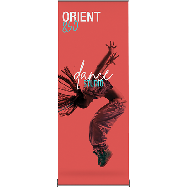 xThe Orient 850 is a high-quality, affordable retractable banner stand option. The custom graphics quickly roll up and store in the base, which features molded end caps for durability. The Orient 850 is approximately 3' x 7' in size and comes with a padded carry bag.