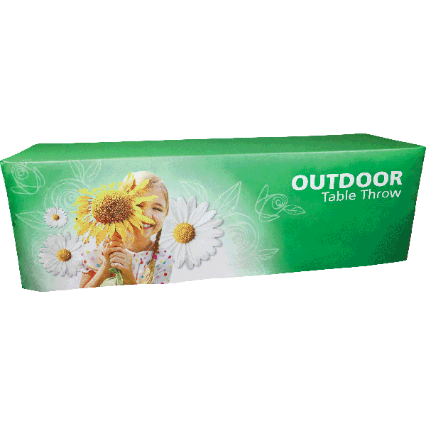 xOutdoor table throws are form-fitted to standard 8ft and 6ft tables, creating a wind-resistant, secure accent for outdoor displays. Fully-printed in the USA on water and spill resistant outdoor canvas to create durable, full-color graphics, the Outdoor table throw will complete any outdoor event or display.