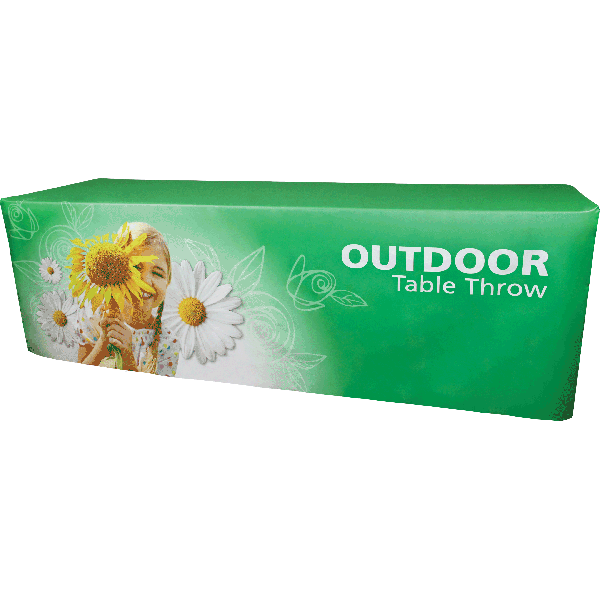 Outdoor table throws are form-fitted to standard 8ft and 6ft tables, creating a wind-resistant, secure accent for outdoor displays.