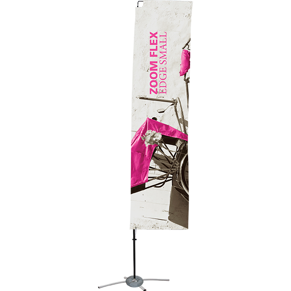 The Zoom Flex Edge Small Flag features a full fiber pole and wind-resistant flag offered in several shapes. For indoor or outdoor use, the flexible design allows the graphic to rotate in the wind.